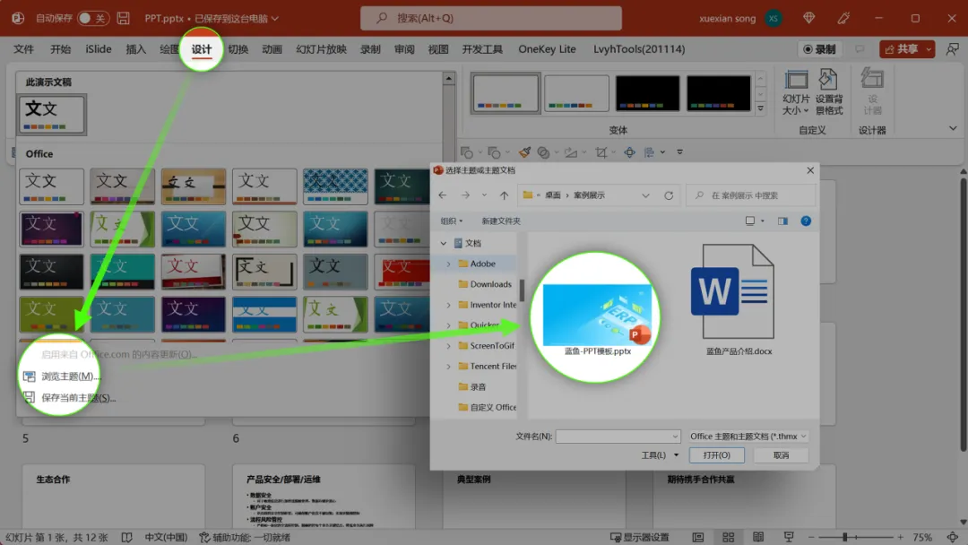 点击设计选项卡,找到浏览主题,选择你们公司的 PPT 模板。