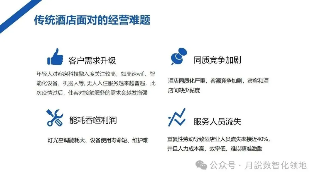 传统酒店长期面临三大核心痛点,与十五五 “高质量发展” 要求相悖,而智慧化转型恰好能精准破解: