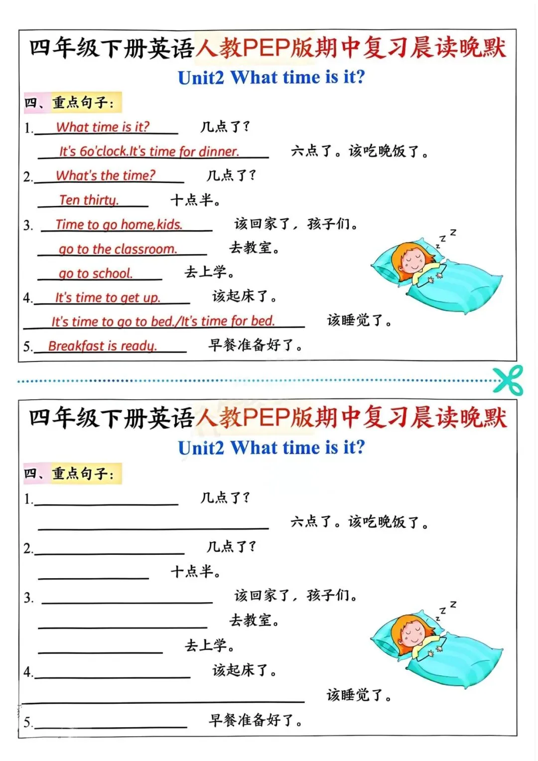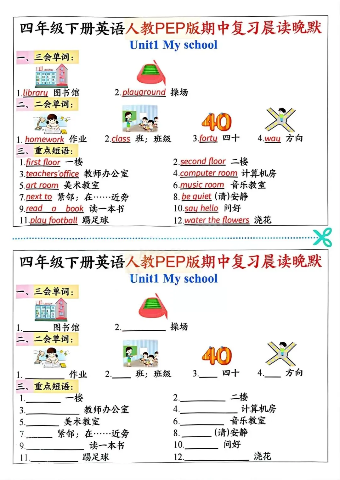 本资料同步人教 PEP 版四年级下册英语期中范围,专为晨读 + 晚默设计,包含核心单词、重点短语、必考句型与情景交际四大模块,采用英汉对照、看中文默英文模式,内容精简、重点突出,贴合期中考点。排版清晰、可直接打印,适合每日晨读背诵、晚间默写检测,助力高效巩固基础、规避易错点,轻松备战期中。