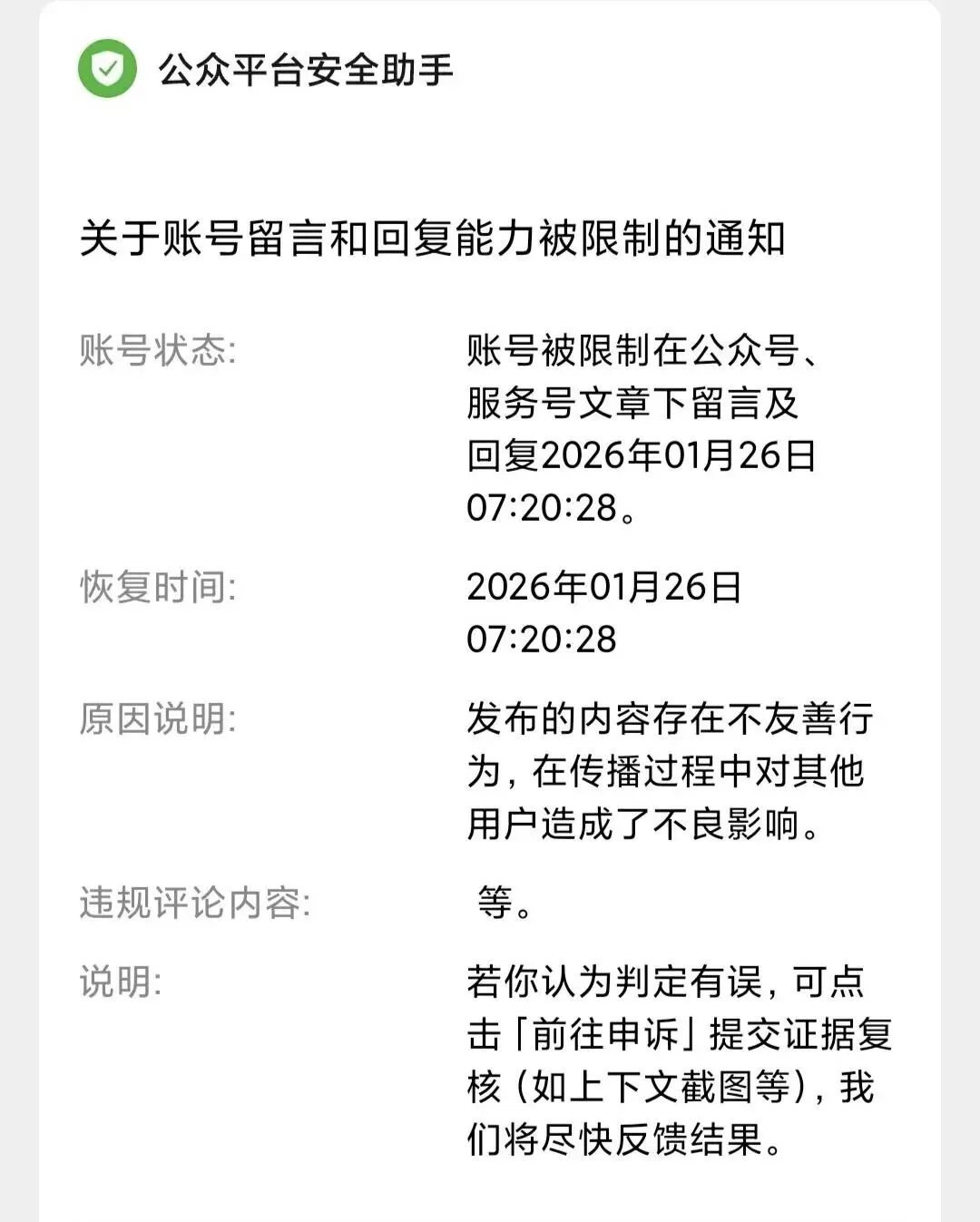 对上一篇文章的说明与补充 ☞新手抱团涨粉,100粉丝互助(附教程) 点上方链接文章(大家注意看文章末尾) 重要提醒 ↓ 1.留言处有置顶说明 2.这是被平台屏蔽的,大家注意敏感词汇,不要轻易留言或回复 3.情节严重时,会被平台限制回复和留言功能(如下图),所以要谨慎对待 END 能被你看到文末,真的很感谢。如果这篇文章对你有一点启发,请在文未为我点个【赞】+【推荐】,也可以【转发】分享给身边的人,你的每一次支持,都是我继续写下去的最大动力。
