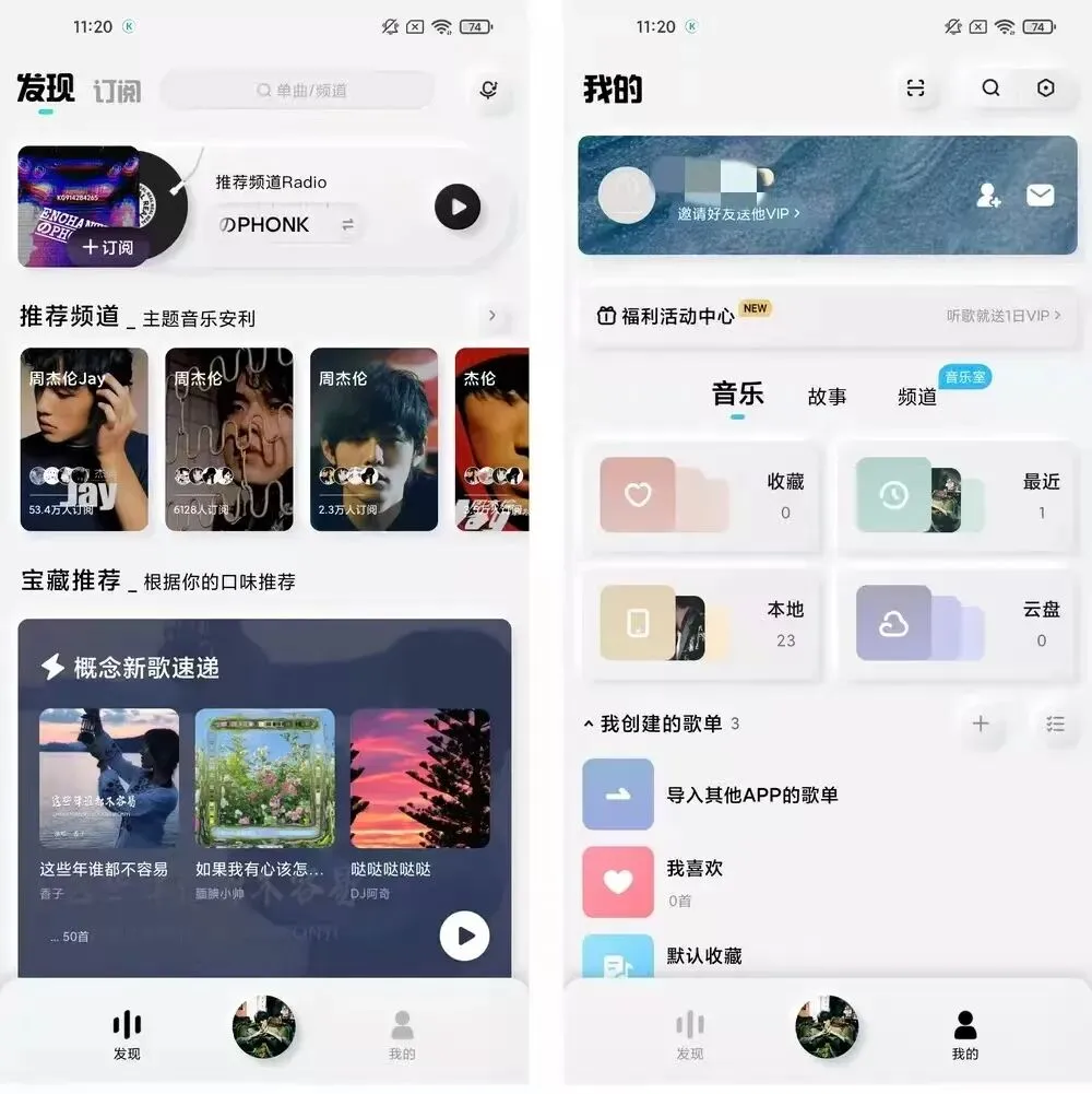 酷狗概念版界面干净、通透。没有直播入口,没有购物页面,只有音乐相关的内容。它将功能集中在“我的”、“发现”和播放三个主要板块。这种设计让用户能更快找到想听的内容,而不是在各种弹窗和推广中来回切换。