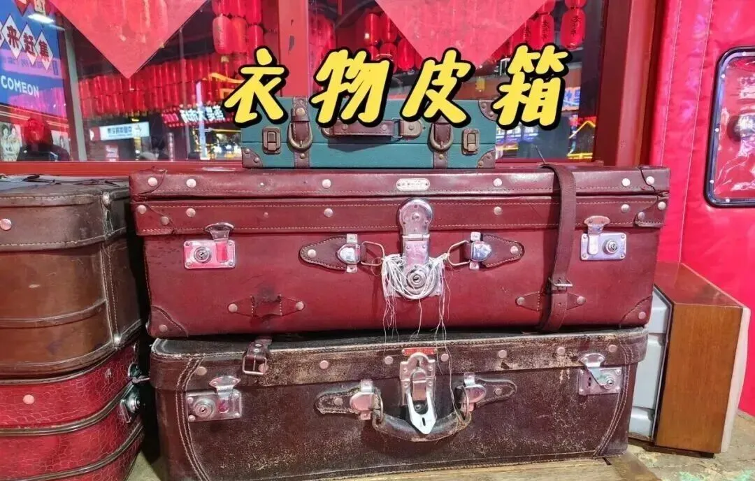 图里摞着一摞的就是当年风光一时的红皮箱,也叫衣物皮箱,外壳硬邦邦,颜色鲜红或者棕绿,正经结婚场面少不了这个家伙,亮银的金属扣,拎起来有点分量,老两口专门把新衣新被塞到里面,糖果压在最上头,炕头一放,叫一屋子小孩直眼热。