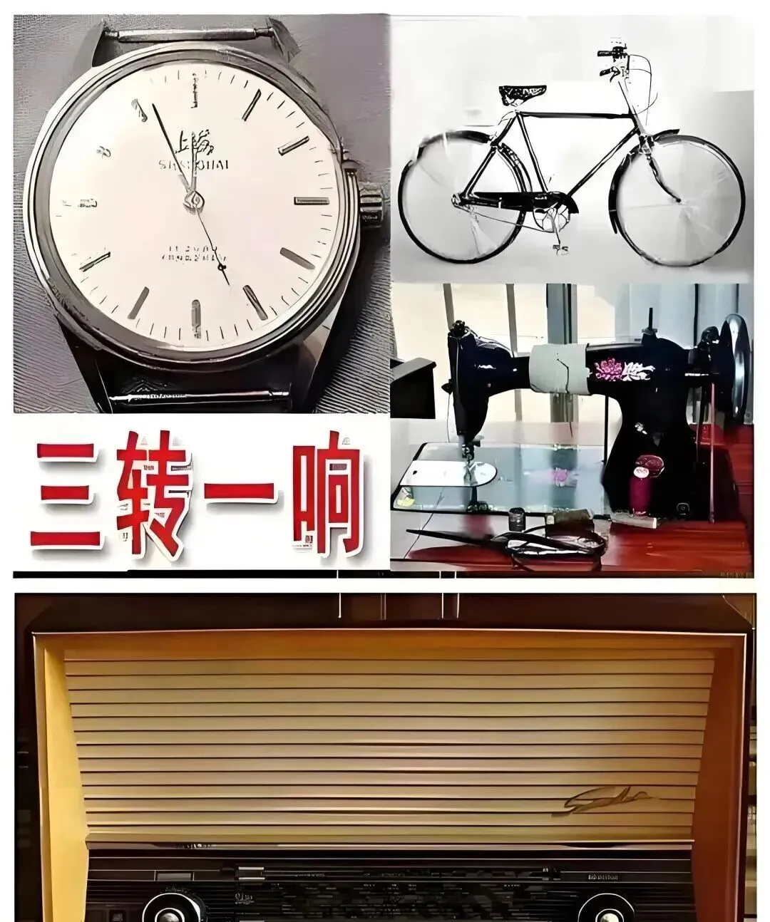 "三转一响"这四个字,看见图里就心里一动,左上是老上海手表,右上是二八大杠自行车,底下是缝纫机和老收音机,七十年代末八十年代初,有这三样,那真叫硬通货,娶亲成家、走门招亲,谁家门口一响鞭炮,一台缝纫机和自行车一起摆出来,明面上的体面。