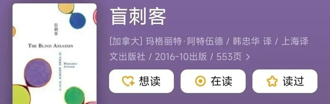2.本书作者为加拿大作家玛格丽特・阿特伍德,原作名The Blind Assassin,版权归原作者及出版方所有;经典中译本由韩忠华翻译,上海译文出版社出版,译本版权归译者及出版社所有,本号仅作资源整理分享,不拥有版权。 -