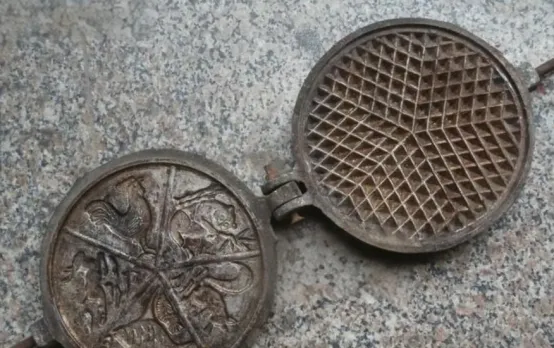 这个铁疙瘩是两片合扣的点心模具,整个用铁铸出来,外圈带着把手,打开来一半一半的,里头是凹槽和花纹,小时候村口谁家里烤点小饼干、印糕点,都爱用它,面糊倒进去,再“咔哒”一合上,铁模架在篝火边,没一会儿屋里飘出一股油香,模具一揭,带着花样的点心就下来了,小孩早就在院子里等着,谁家有这么个家伙,邻里街坊都能闻香而来,现在超市随便买,花样不缺,就是没小时候那个劲头。