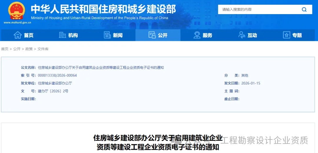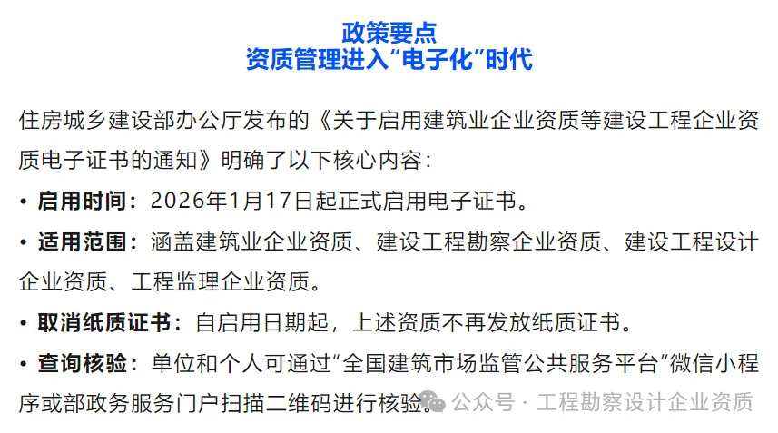 一、自2026年1月17日起,下列住房城乡建设部核准的建设工程企业资质启用电子证书(样式见附件),不再发放纸质证书。