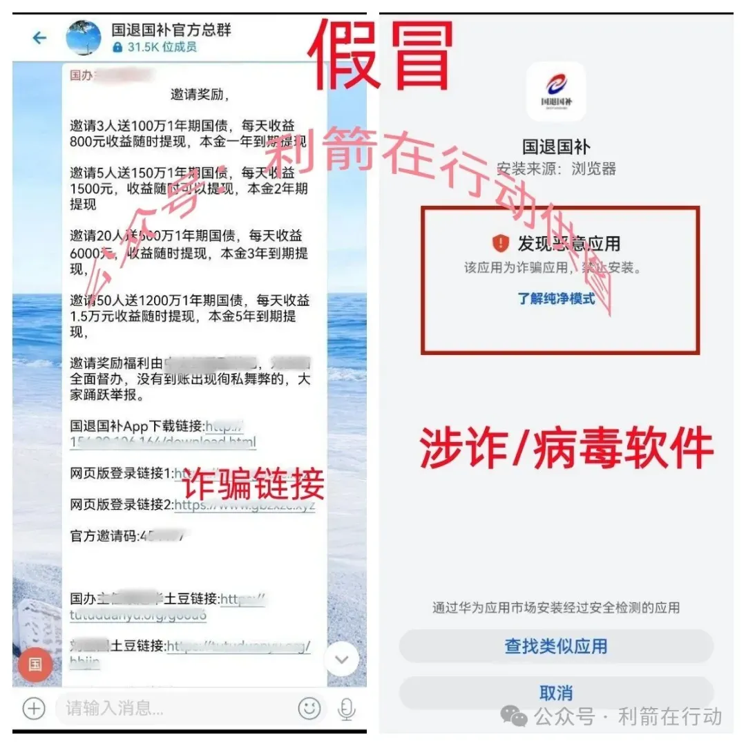 提醒:“国退国补”APP是民族资产解冻类诈骗项目,前期以“高额回报”做“诱饵”,骗取参与者身份信息,骗更多人快速入坑,后期会对进入该项目的人进行精准诈骗,提醒家中亲人不要上当被骗。