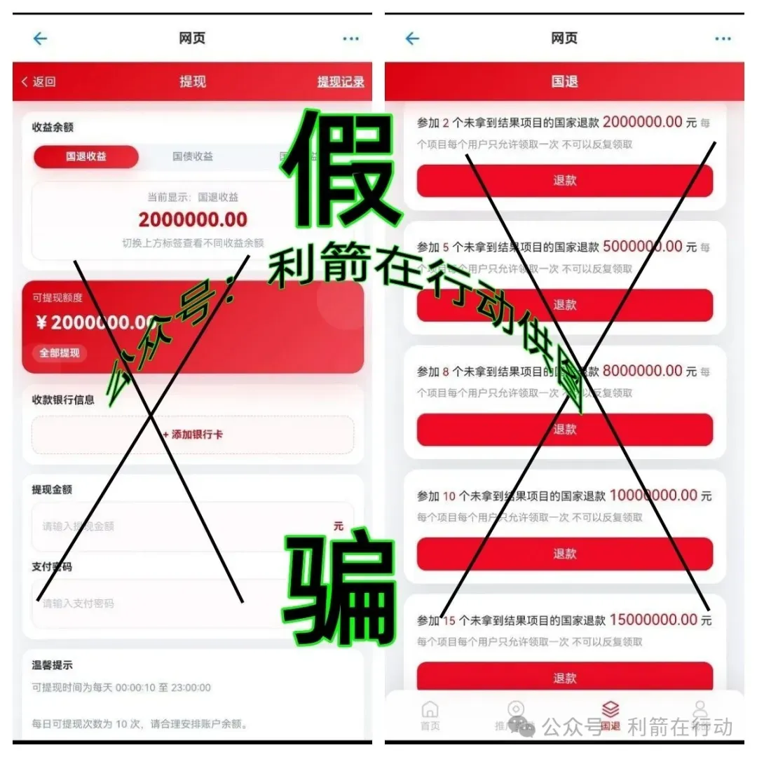 假冒官方,刚上线的“国退国补”APP宣传是“国家项目”,群里面与APP里面假冒国家工作人员的骗子谎称:只要参与各种项目没有兑现的,在“国退国补”APP里面都可以兑现,邀请人注册“国退国补”APP,还要根据邀请的人数来送相应的“国债”,当然这上百万的国债全是假的,一串串虚假的数字,诈骗道具而已!