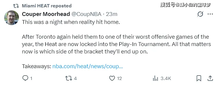 热火记者Couper写道:这是一个让人深有感触的夜晚,热火在多伦多再度被限制出本赛季最差的进攻表现,热火已经确定参与附加赛,现在唯一的悬念就是热火最终排在附加赛上半区还是下半区。