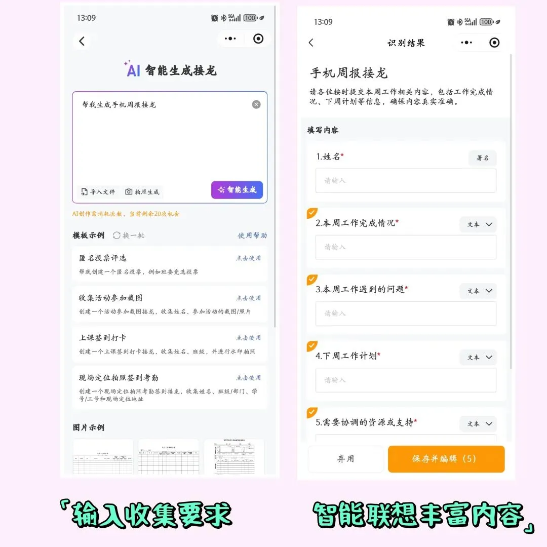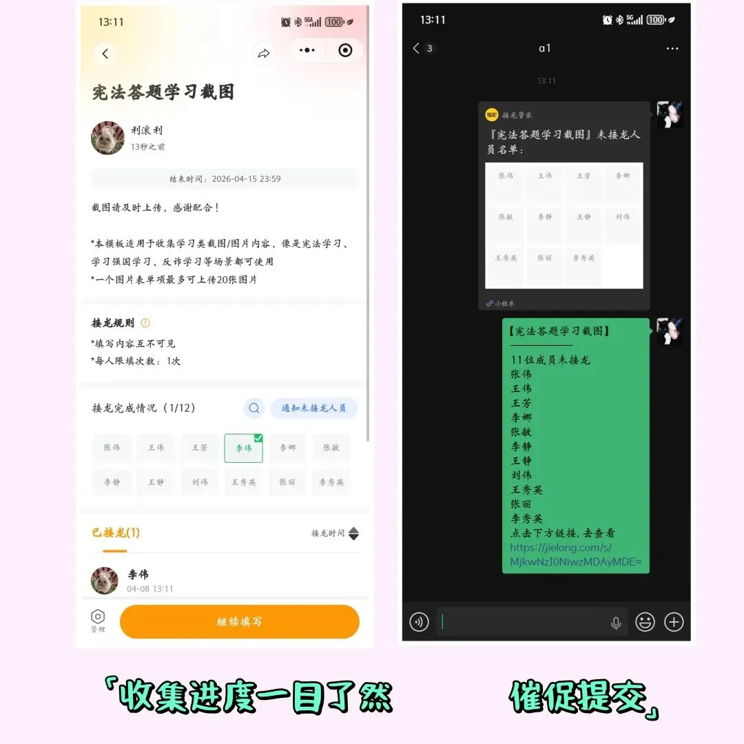 无论是老师收取学生的作业(学生可上传文档、照片、录音、视频),班委收集报名表和作品集,还是公司行政收集各类报表截图,一个接龙管家就能满足所有场景的信息收集需求。