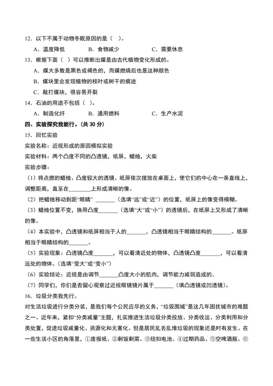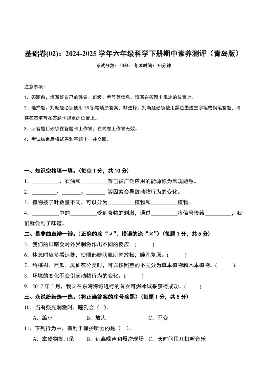 六年级下册青岛版科学期中素养测评卷(电子版可打印附答案)