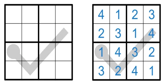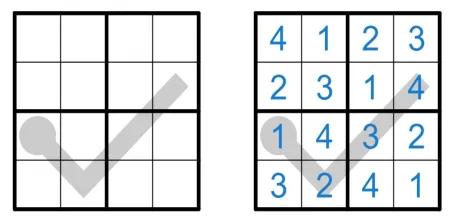 四阶数独规则, 将数字 1-4 填入空格, 使得每行、 每列、 每宫内数字均不重复。