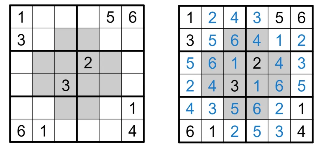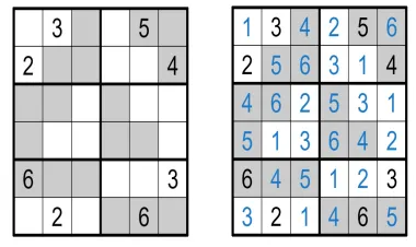 将数字1-6填入空格内 , 使得每行、每列 、每宫内数字均不重复。灰色格内只能填较大数(4 、5 、6 ) ,白色格内只 能填较小数 ( 1 、2 、3 )。