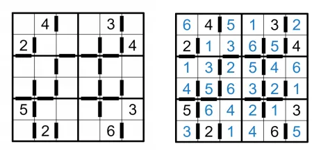 将数字1-6填入空格内,使每行、每列、每宫内的数字均不重复。两格之间的粗线标记表示这两格为连续数, 差值为1,所有符合该条件的均 已标出。