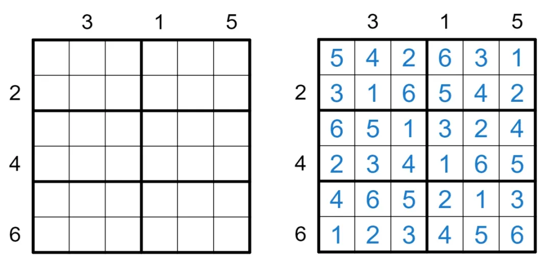 将数字1-6填入空格内, 使每行、每列及每宫内数字均不重复。