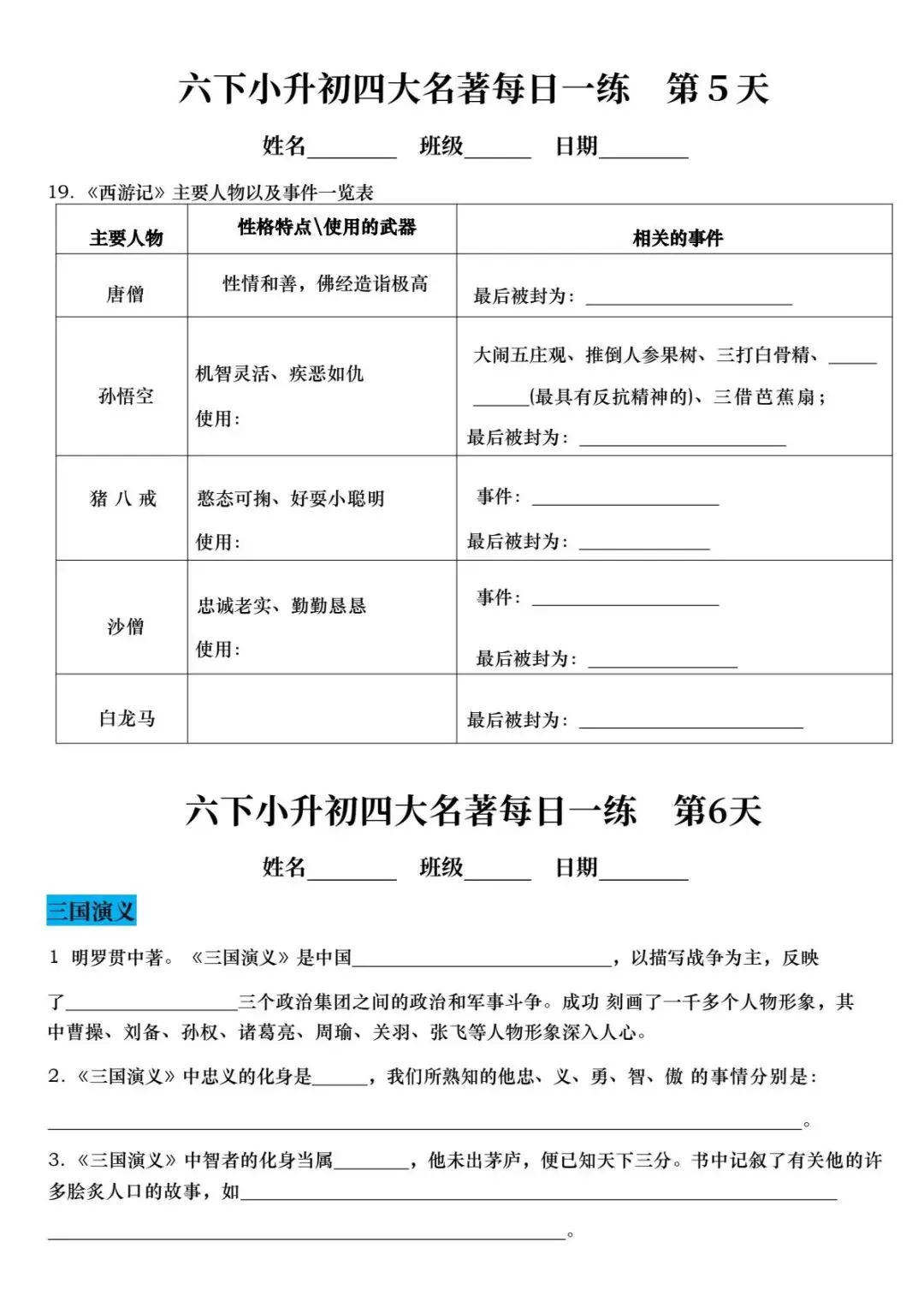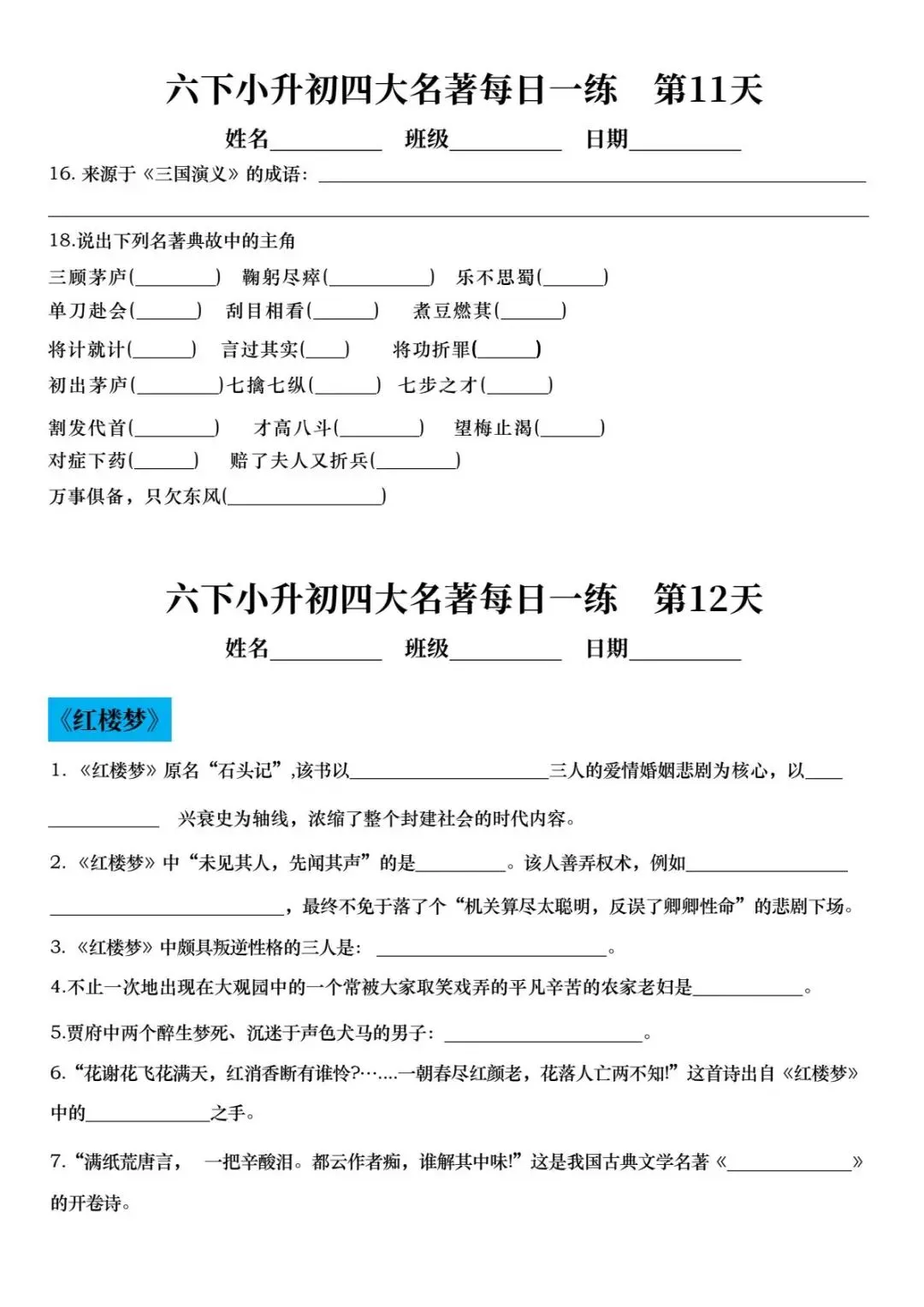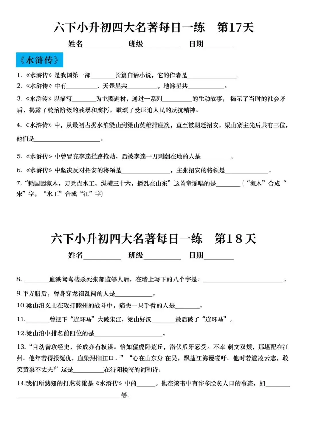大家好,我是木木妈,专注于幼小衔接与小学教育教学资源分享。如果大家觉得我分享的资料不错,可以分享给周边的家长。用优质的学习资料帮助孩子学习成长。今天木木妈给大家分享的是:四大名著必考点每日一练。