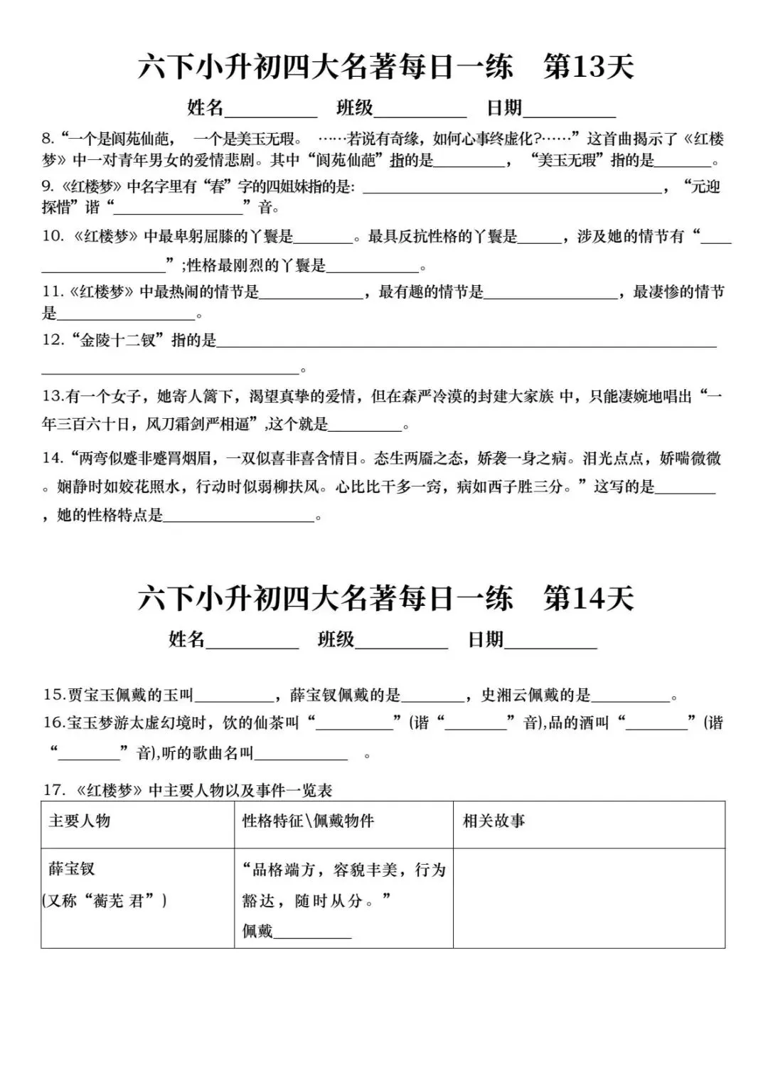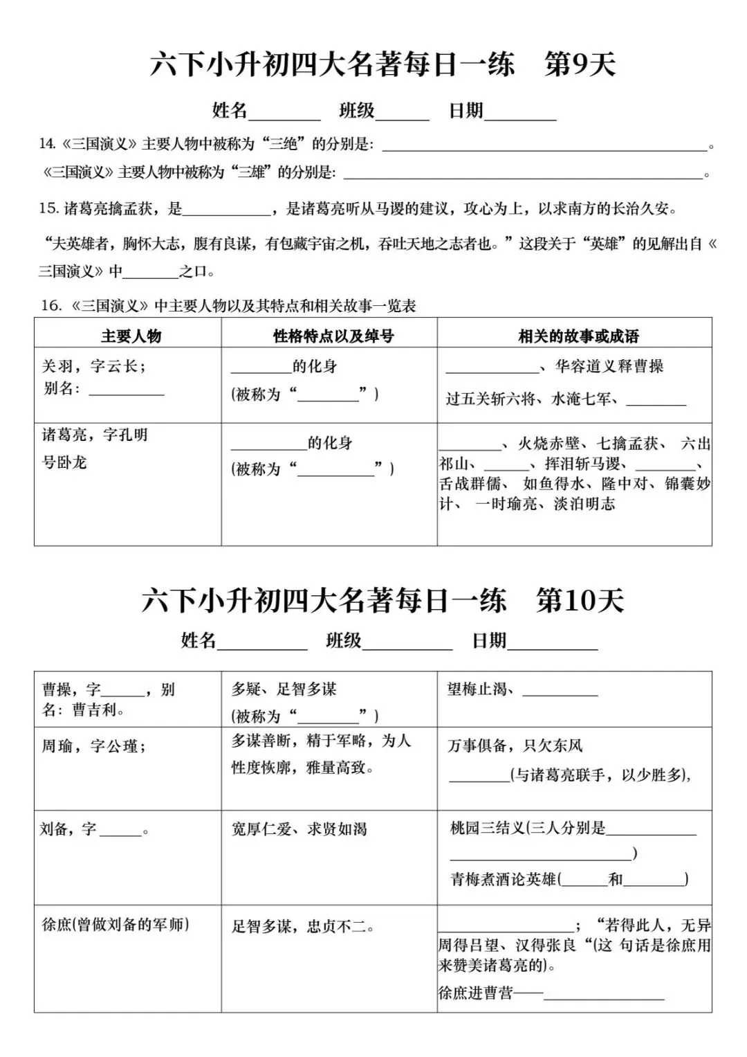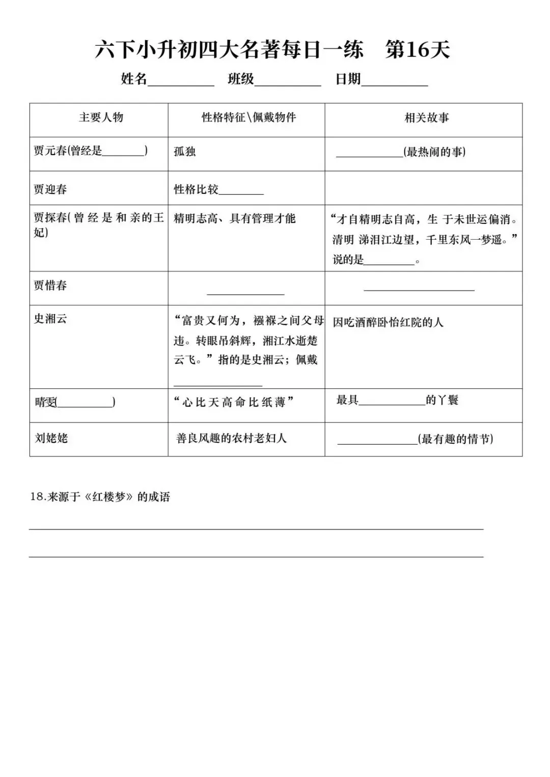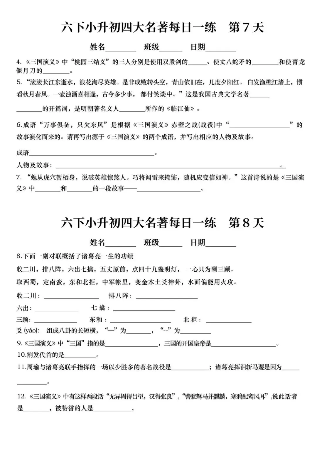 大家好,我是木木妈,专注于幼小衔接与小学教育教学资源分享。如果大家觉得我分享的资料不错,可以分享给周边的家长。用优质的学习资料帮助孩子学习成长。今天木木妈给大家分享的是:四大名著必考点每日一练。