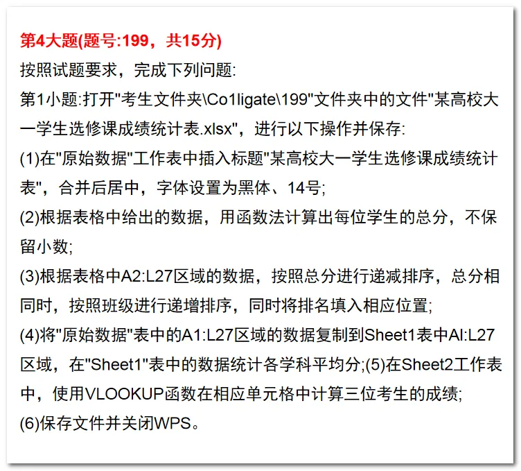 (4)将”原始数据”表中的A1:L27区域的数据复制到Sheet1表中Al:L27区域,在”Sheet1″表中的数据统计各学科平均分;(5)在Sheet2工作表中,使用VLOOKUP函数在相应单元格中计算三位考生的成绩;