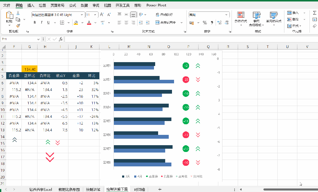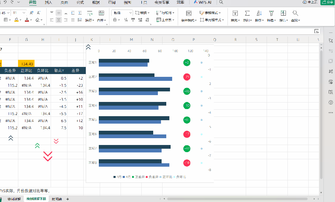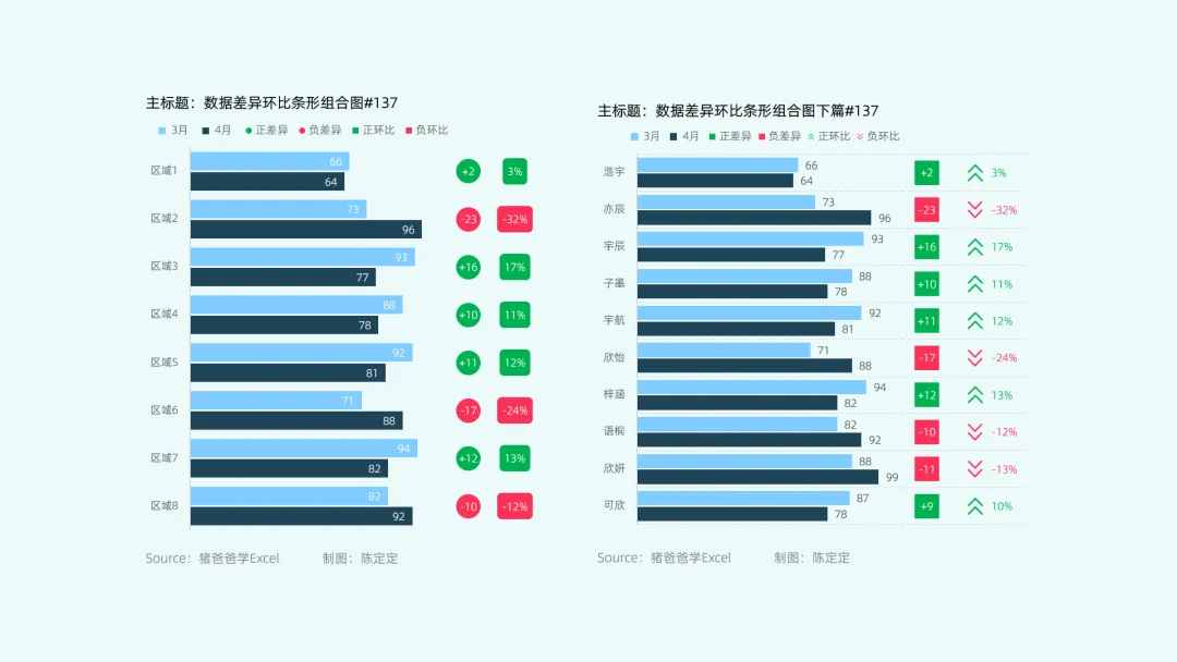 适用于两组数据,多指标对比可视化展示,可以是差异值、环比、完成率等多种指标。