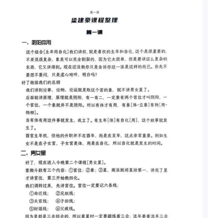 梁建豪52课整理笔记.pdf 196页 如果您对传统文化(梅花易数、风水堪舆、中医偏方、紫薇六爻、奇书典籍等)内容感兴趣,可关注此号,有福利领取! 梁建豪52课整理笔记.pdf 196页 本套课程的核心,在于传授紫微斗数“象数心学”之奥妙。然梁老师治学,素来主张兼收并蓄、破除门户之见。故在课程之中,读者将清晰感受到其融汇多派精髓的鲜明特色。剖析一个命理现象或人生事件,梁老师常能同时运用飞星、飞宫乃至南派等多种技法多个派别相互印证、交叉论断,展现出丰富的所学与深厚的功底。 微信:qyp3131313 整理不易,非免费 图片和文字部分来自网络,如有侵权,联系必删除 喜欢就点个赞和在看吧