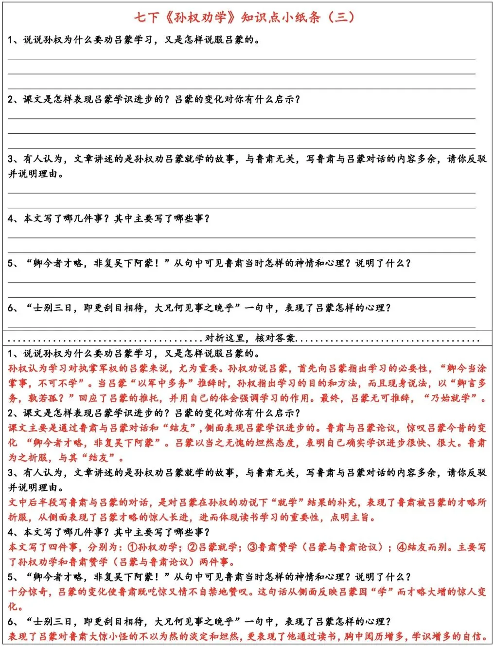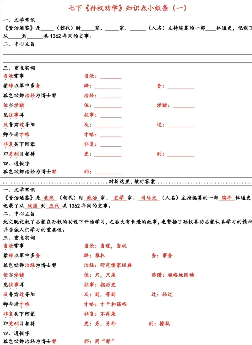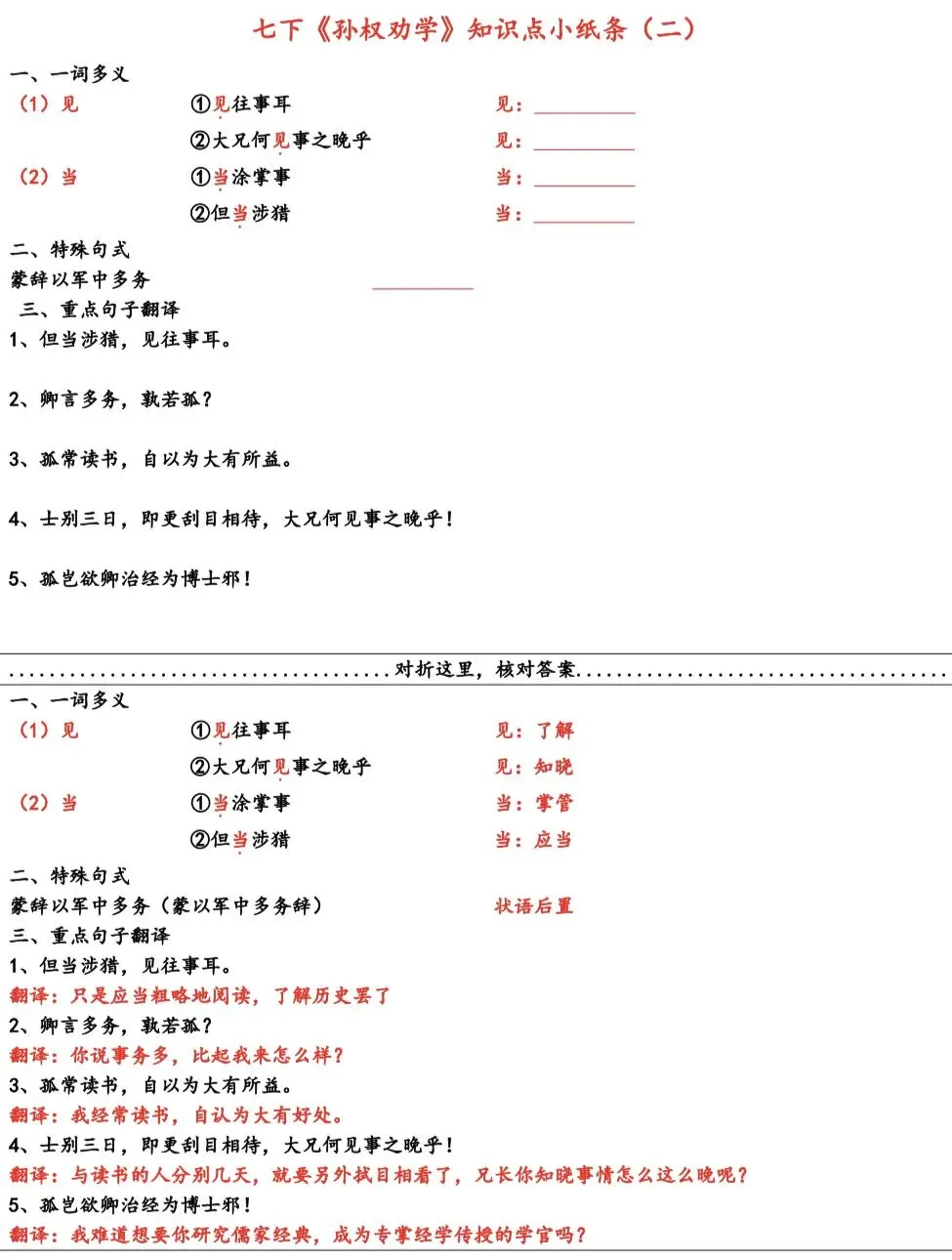 七下语文|文言文知识点小纸条(可打印电子版) 今天为大家分享 【七下语文文言文知识点小纸条电子版】 文末下载电子版 完整电子版获取方式如下: 七下语文文言文知识点小纸条链接: https://pan.baidu.com/s/1MyR7kCE6JvCesXVO0Z4L6g?pwd=x22F 复制这段内容打开「百度网盘APP 即可获取」 想获取七下语文其他内容请点下方链接: 七下语文|每课重难点每日一练电子版(可打印) 七下语文|读读写写字词注音电子版(可打印) 七下语文|第一次月考考前押题清单(可打印电子版) 七下语文|课内古诗词 一课一页+答案(可打印电子版) 七下语文|必背古诗文逐篇默写+答案(可打印电子版) 七下语文|古诗文早背晚默任务单(可打印电子版) 想获取其他初中语文资料的朋友,请关注下方公众号,私信或留言资料名称,无偿分享~ 注:本账号分享内容为网络整理,侵删致歉。 麻烦大家点赞+转发,你的每一份支持,都是我持续更新分享的动力,万分感谢!!!