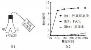9 .为了探究酶的催化效率,某同学在适宜条件下采用如图 1 所示装置进行三组实验,甲管中盛放等量的体积分数为 3%的 H2O2 溶液,乙管中分别盛放等量的新鲜的质量分数为 20%的肝脏提取液、质 量分数为 3.5%的 FeCl3 溶液、蒸馏水。将甲、乙中的液体混合均匀后,每隔 50s 测定一次装置中的 相对压强,实验结果如图 2 所示。下列相关叙述正确的是