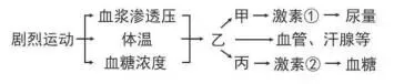 14 .运动员在比赛时机体内体温、渗透压和血糖调节部分过程的示意图如下,甲、乙、丙表示有关