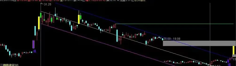 下轨:IF(NP>FP,IF(UTL<=RH,UTL,DRAWNULL),IF(UTL>=RL,UTL,DRAWNULL)),COLORFF00FF;