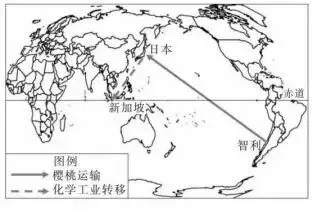 日本工业具有外向型特点,原料和燃料大量依赖进口,产品主要输往国际市场;20世纪 80年代,日本 重工业大规模向外转移。日本和智利都是世界樱桃生产大国,日本每年从智利进口大量樱桃。下图示 意日本樱桃进口线路和化学工业转移方向。