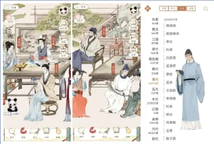 打开软件就让人眼前一亮,多个古人栩栩如生,怡然自得,有正在弹琴的,有吹笛子的、有画画的、有喝茶的、有舞剑的、有交谈的、有和小猫玩耍的,都通过好看的动画呈现,部分动画还支持交互,例如点击吹笛子的古人可以切换背景音乐、点击古人还支持不同音色朗读诗词。