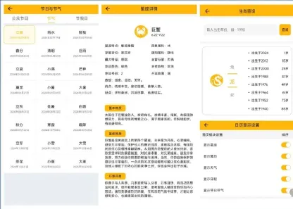 它体积小巧,使用流畅,支持的功能包括:万年历黄历、节日节气、天气预报、日程管理、日程提醒、待办事项、倒数日、生日、纪念日、生肖查询、星座查询、星座详情、日期间隔、日期转换、日期推算、世界时间、全屏时钟、电子木鱼、桌面组件。
