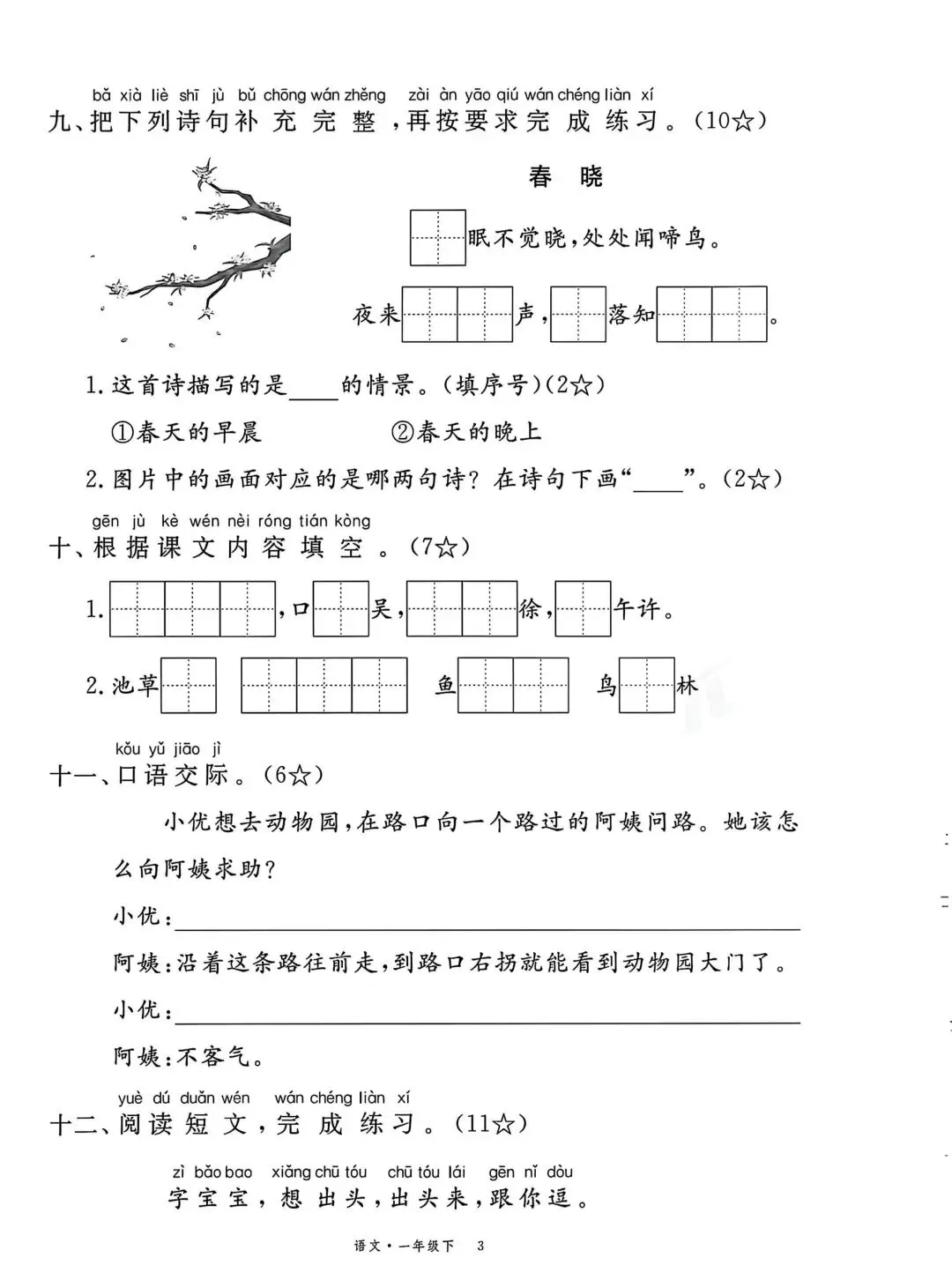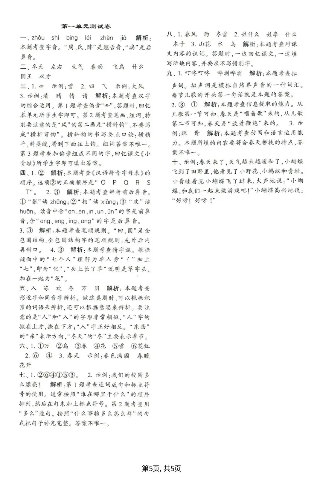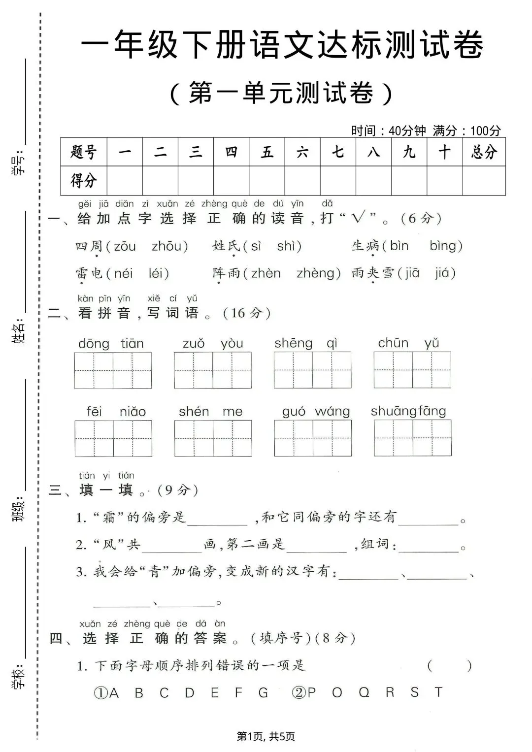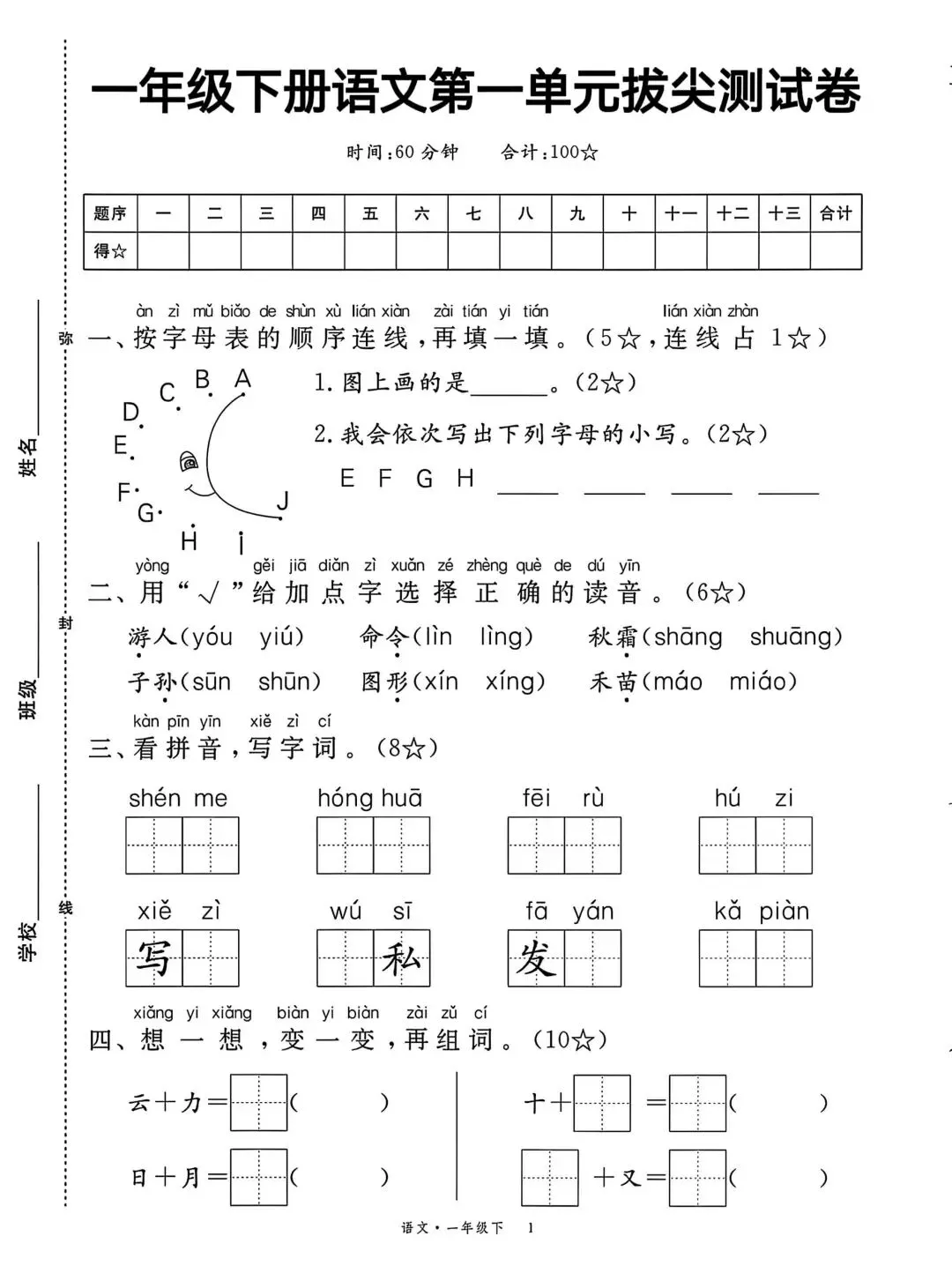 一年级下册语文第一单元测试卷可打印|达标测试卷+拔尖测试卷