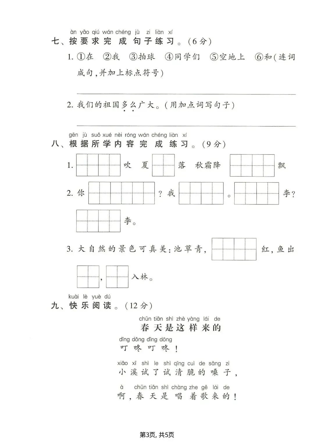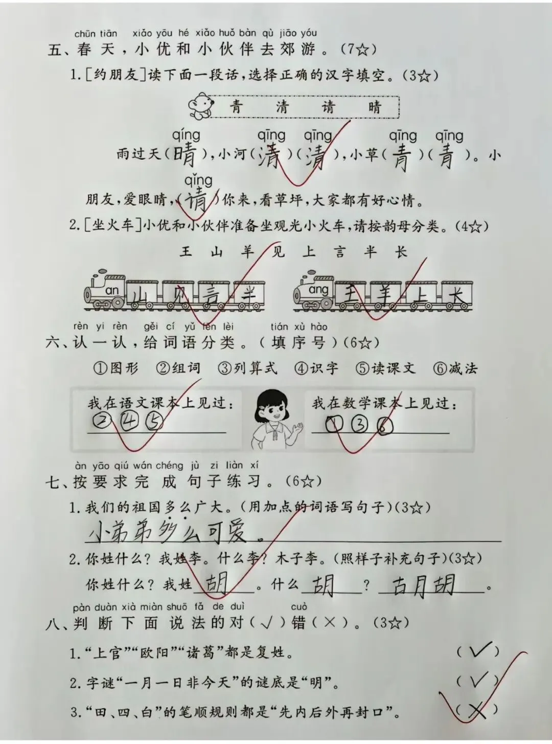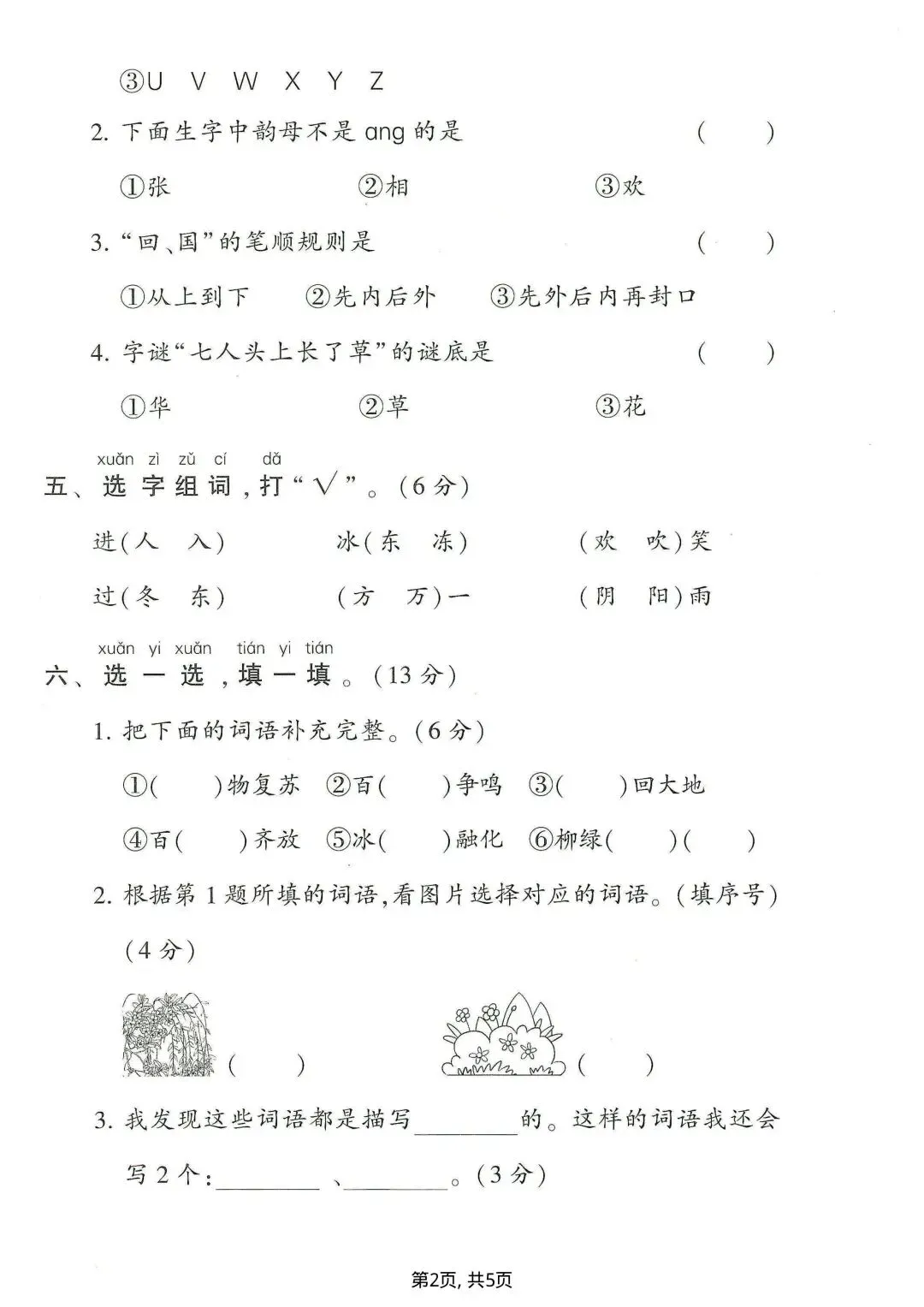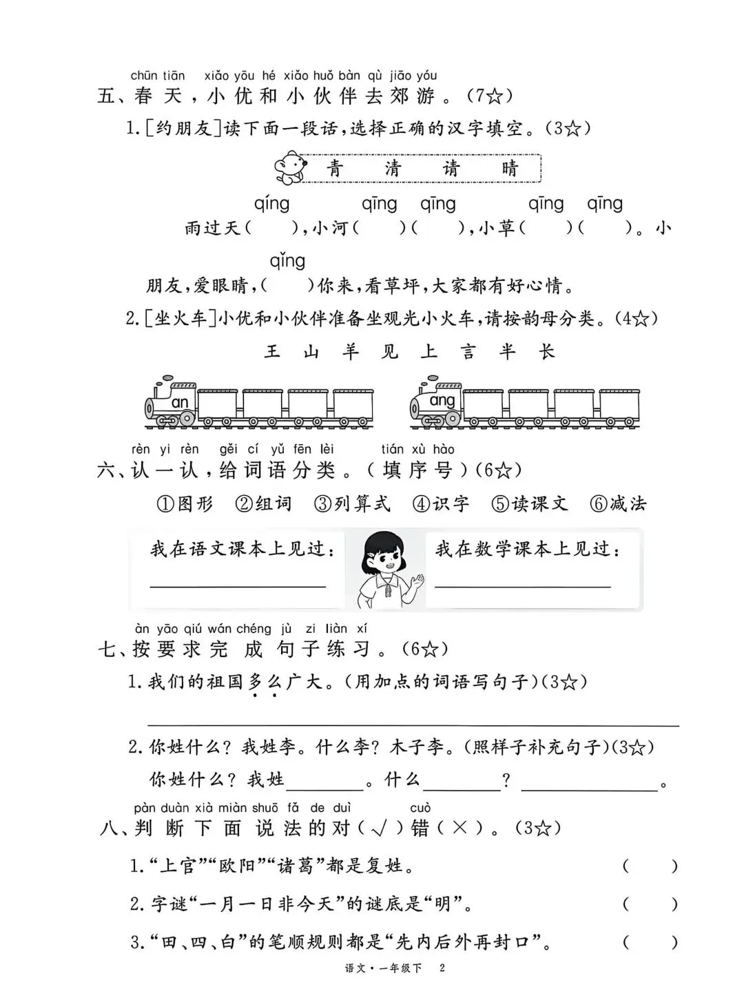 达标测试卷侧重基础过关,题型包括读音选择、看拼音写词语、偏旁笔画、字谜、词语补充、连词成句、阅读和写话,全面检测课内知识的掌握情况,适合课后同步巩固。