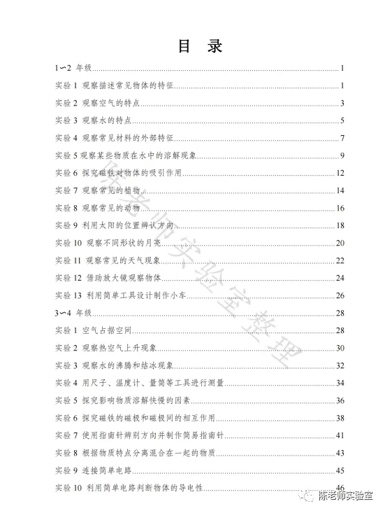 这些探究实验是各个版本通用的,所以可称做是小学科学的标准实验。如何落实课标准实验教学,东部某省教育装备部门根据2022版新课程标准制订的小学科学实验教学指导手册,手册上完整全面介绍了新课标中各年段必做探究活动实验,手册目录上可以看到,各年段的实验目录与课程标准的实验数量完全一致。