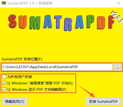 2、双击或以管理员身份运行“SumatraPDF-3.6.1-64-install.exe”按提示步骤安装,选择安装路径(建议保持默认路径),依据需求勾选