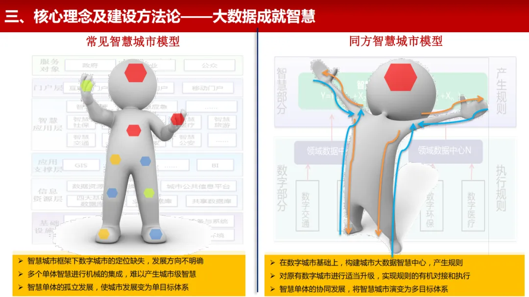 同方智慧城市解决方案以“大数据成就智慧”为核心理念,将城市比作一个有机体,构建能够产生智慧的“大脑”——城市级大数据智慧中心。该中心通过“三跨一体化大数据平台”(跨部门、跨行业、跨区域),实现数据的资源化、价值化和智慧化。