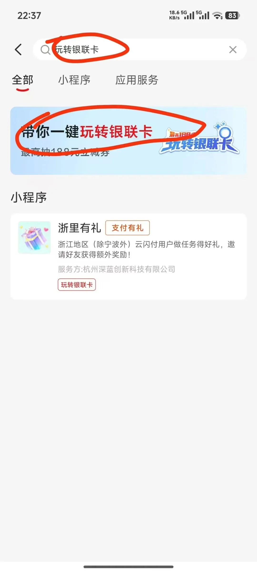 进入云闪付APP首页,直接搜索“玩转银联卡”按图示点击进入活动页面,去完成对应的任务然后进行抽奖,或者直接扫码进入活动页面