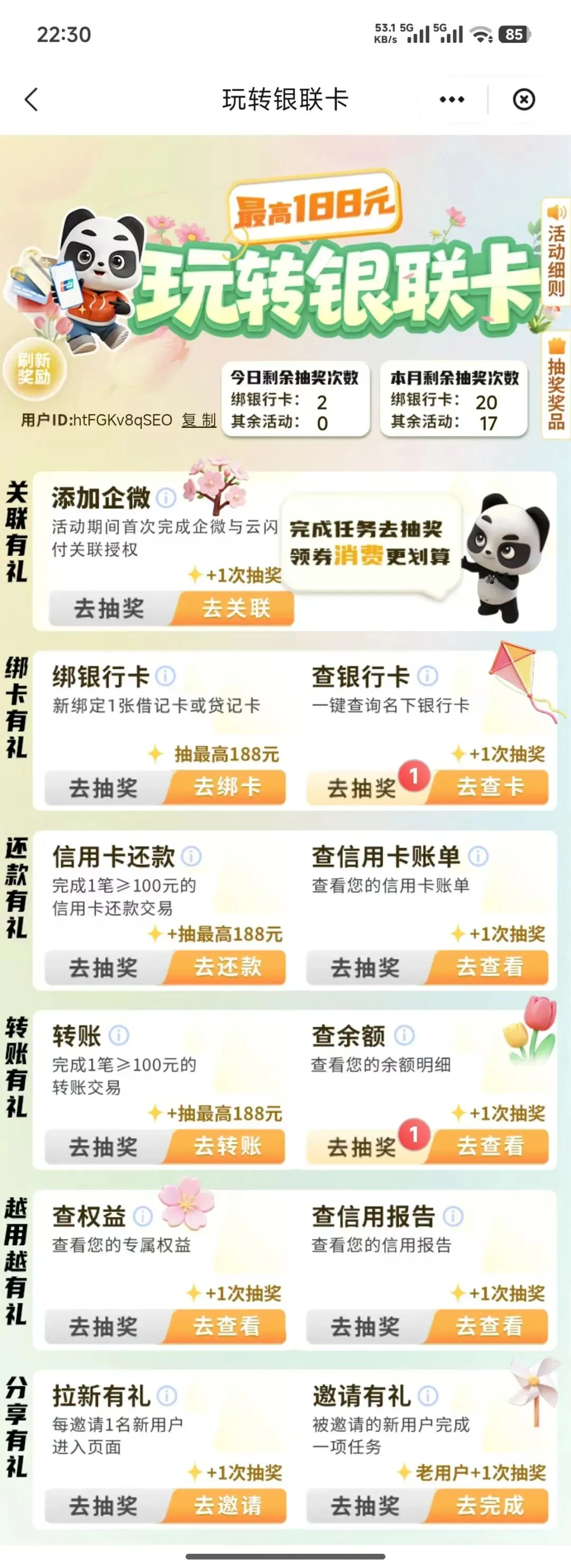 注意除绑卡任务外,单日限抽奖2次,当月限抽奖20次,并且奖励金要在4月30日前使用,
