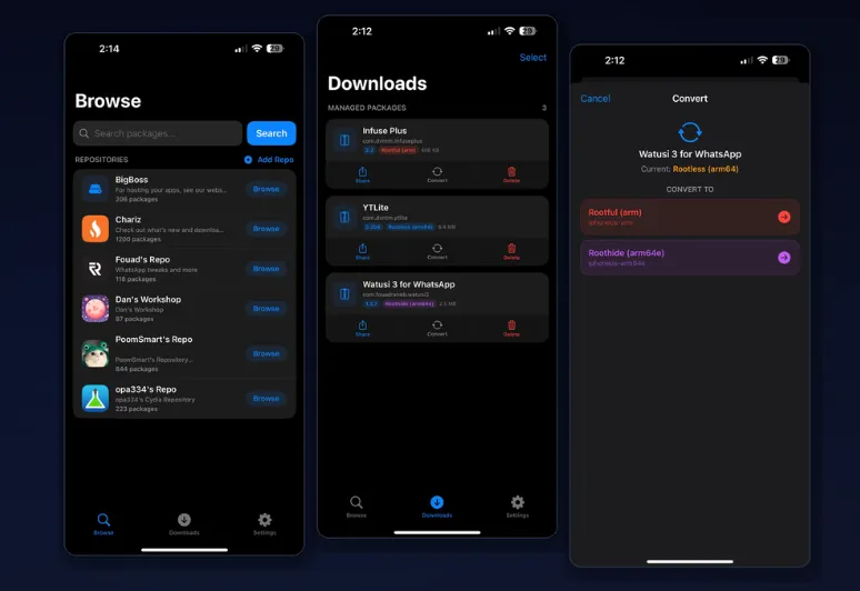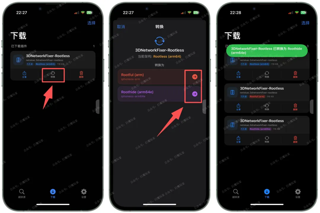 主要功能:支持下载越狱源 deb 插件;支持转换将插件转换为有根/无根/隐根。