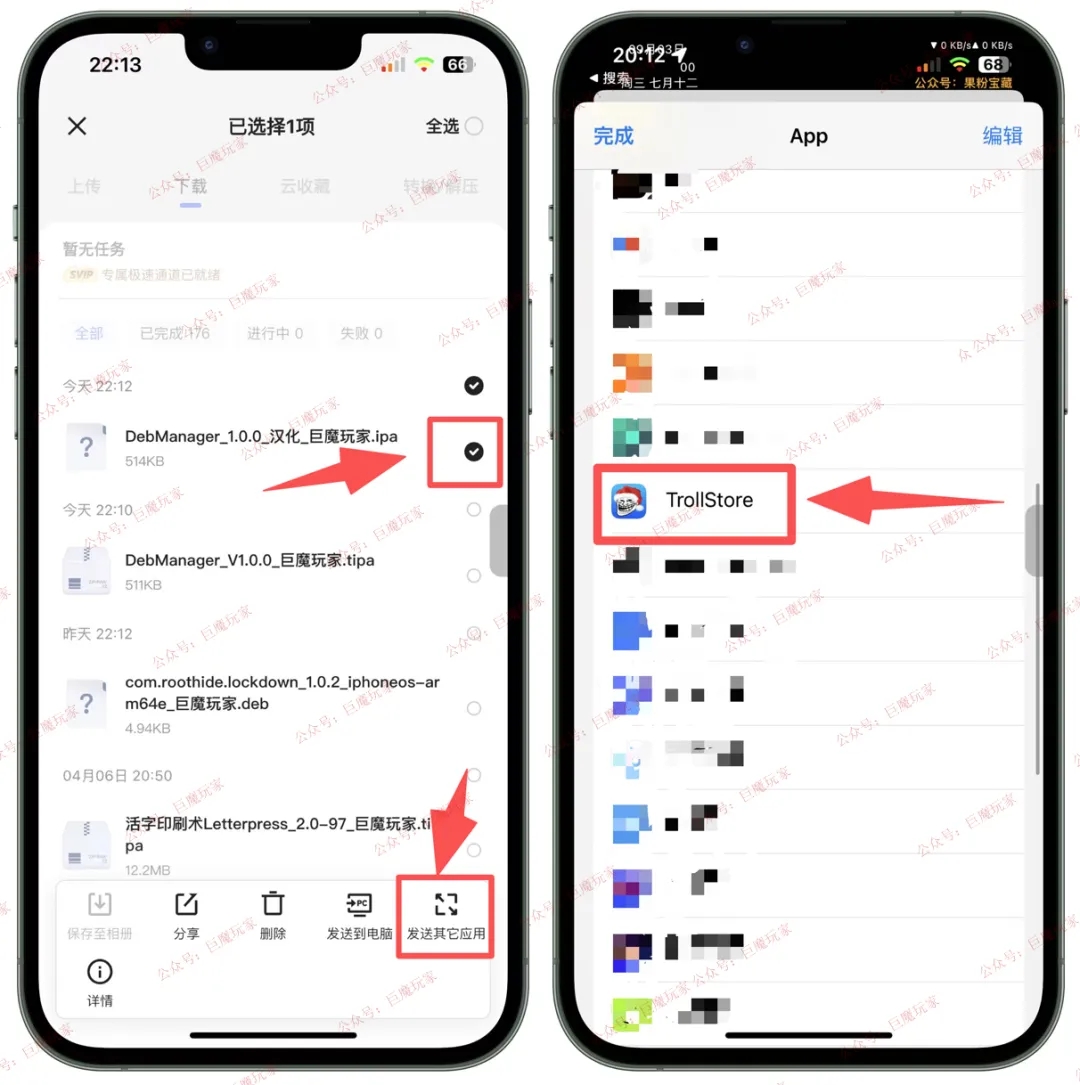 ①、巨魔安装:以夸克为例:【长按】下载的【Deb Manager.tipa】-【发送到其他应用】,选择【TrollStore】,点击【安装】即可安装成功。
