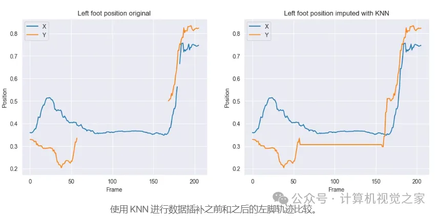为了解决这个问题,我选择使用具有5 个最近邻居的K-Nearest Neighbors (KNN) 来填补缺失值。这种方法有助于适应非线性运动轨迹,提供更一致的输入数据并提高模型的准确性。