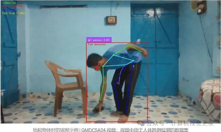 为了排除过拟合,我使用外部数据集中的视频测试了该模型,例如GMDCSA24:视频中人体跌倒检测的数据集。跌倒检测非常准确,可以正确识别跌倒视频和相关姿势。但是,在某些情况下,它会产生误报,在没有发生跌倒的场景中检测到跌倒,例如弯腰捡起物体、在地板上做俯卧撑或躺在床上。