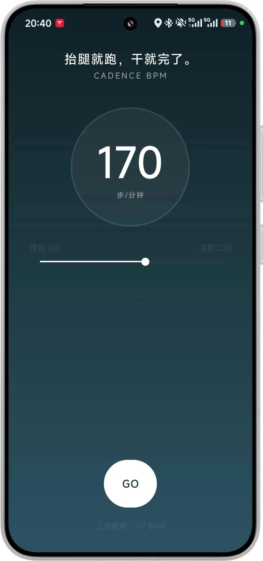 深色渐变UI,圆形BPM显示,顶部一行字:”抬腿就跑,干就完了。”