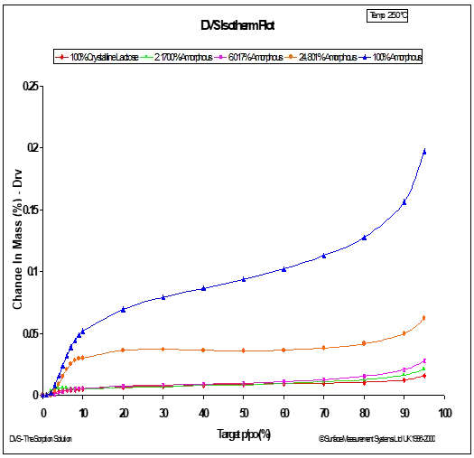 图 2. 一系列已知无定形含量的乳糖辛烷吸附等温线