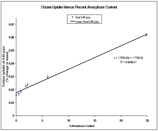 图3. 辛烷蒸气吸附量与无定形含量的关系(校准曲线)