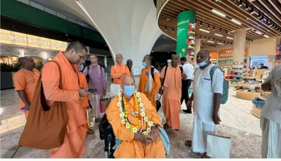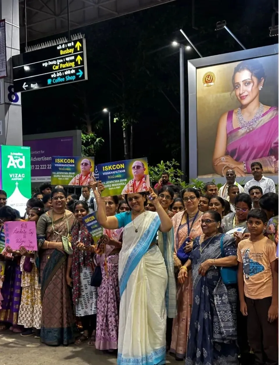 许多奉献者们在机场外等候。他们举着横幅、做着克依尔坦(kirtan)来欢迎我。我祝福了所有奉献者们,随后我们便启程前往曼迪尔。