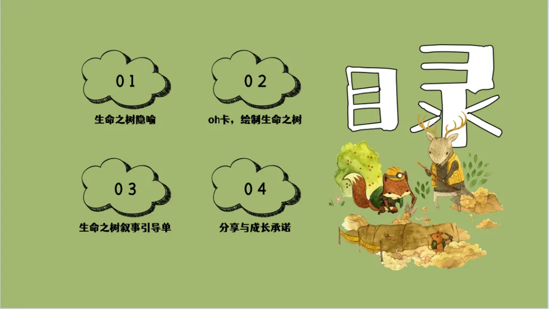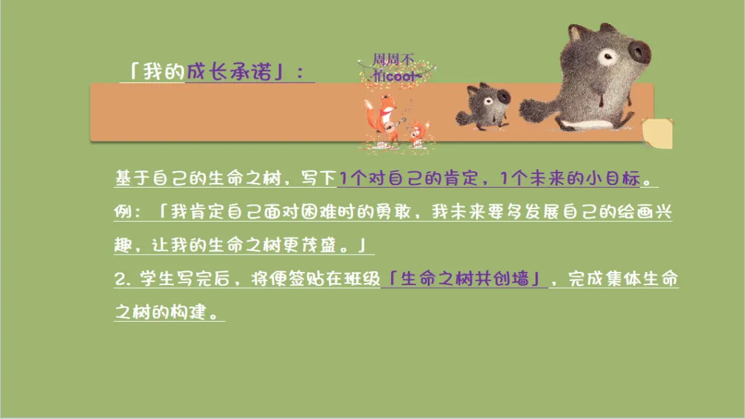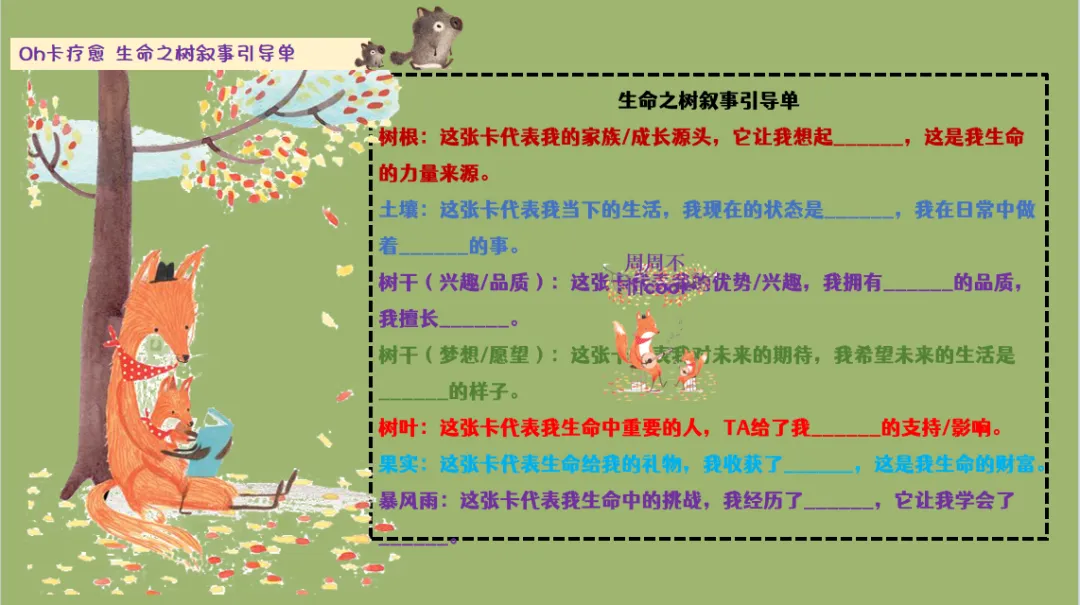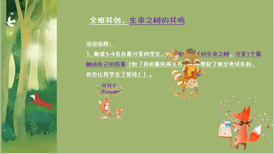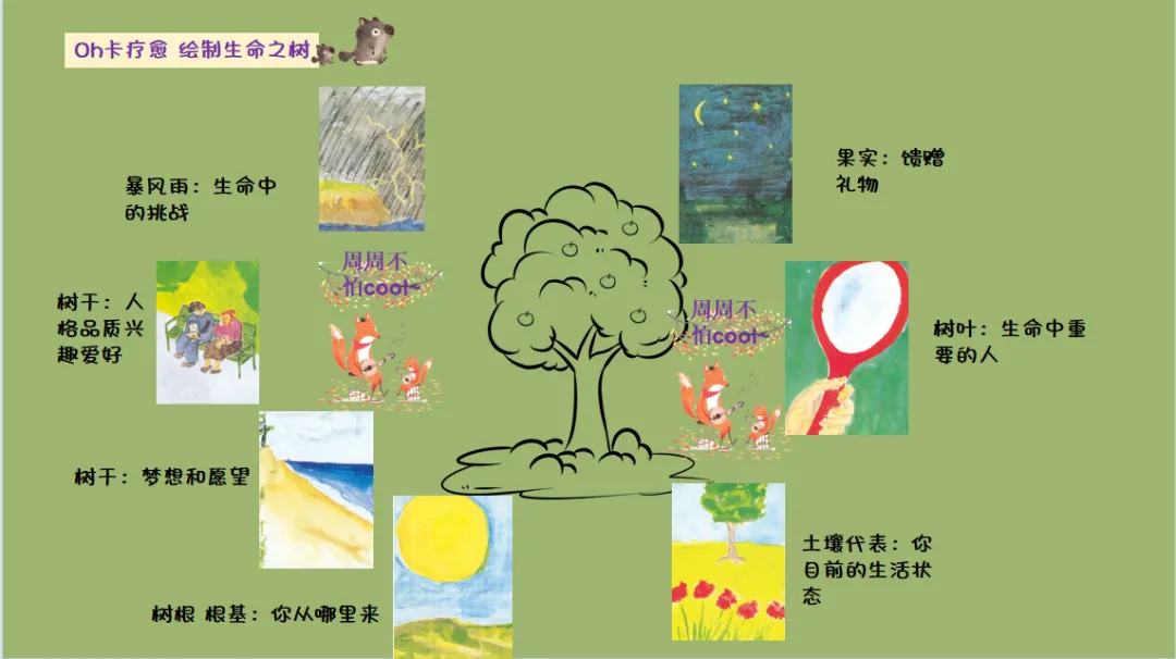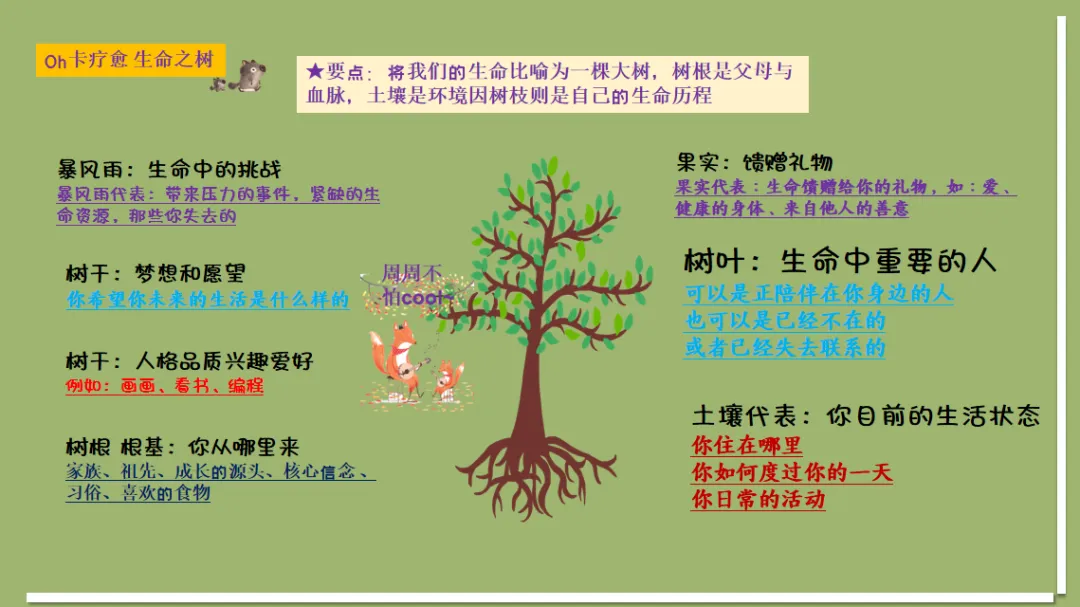• 「生命之树」的隐喻天然契合生命发展规律:树根代表家族与成长根基,土壤代表当下生活环境,树干代表自我特质与未来愿景,树叶代表重要他人,果实代表生命馈赠,暴风雨代表成长挑战。这一结构完整覆盖了个体生命的过去-现在-未来,帮助学生建立对自我生命的全景式认知,看见成长的连续性与完整性。