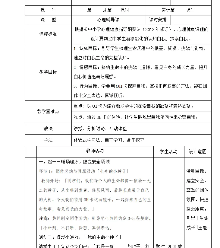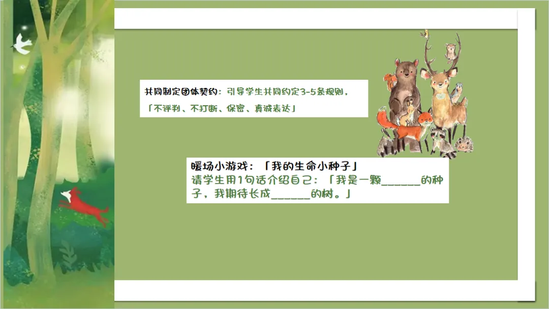 以「生命小种子」暖场与团体契约制定为起点,核心是建立「不评判、不打断、保密」的安全团体氛围。初中生正处于自我认同形成的关键期,对他人评价高度敏感,只有在安全的心理场域中,学生才愿意敞开心扉,完成真实的自我探索。