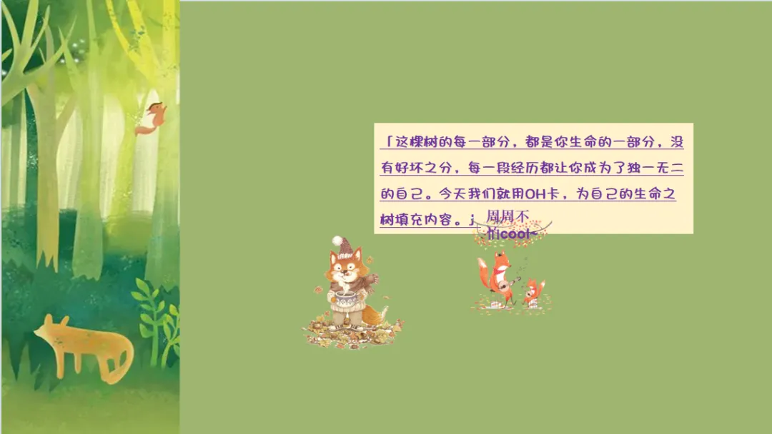 以「OH卡选卡+生命之树绘制+自我叙事」为核心主题活动,引导学生完成从「潜意识投射」到「意识化表达」的转化。通过对应生命之树的7个维度选卡、书写,帮助学生系统梳理成长中的资源、挑战、支持与愿景,在自我对话中看见自身的力量,接纳生命中的不完美。