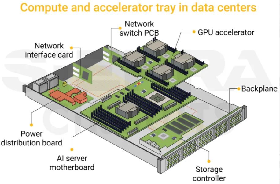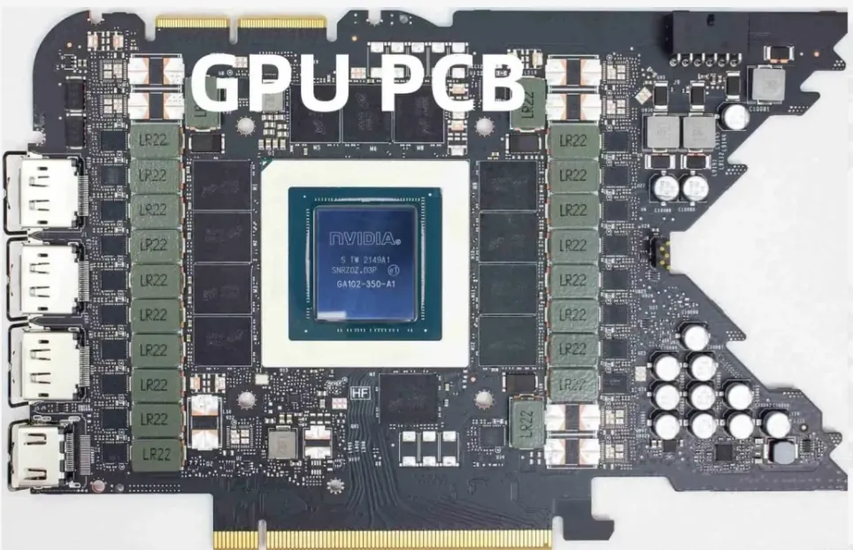 GB300 功率密度极高(NVL72 机架可达 MW 级),如果只测芯片热,实际部署时 VRM 过热会导致系统降频甚至损坏。TTV 必须模拟完整热 profile,否则冷却方案“纸上谈兵”。下面这张典型高功率 AI 加速卡 PCB 布局图,清晰标出 GPU、VRM(电压调节模块)和周边电源元件的位置: